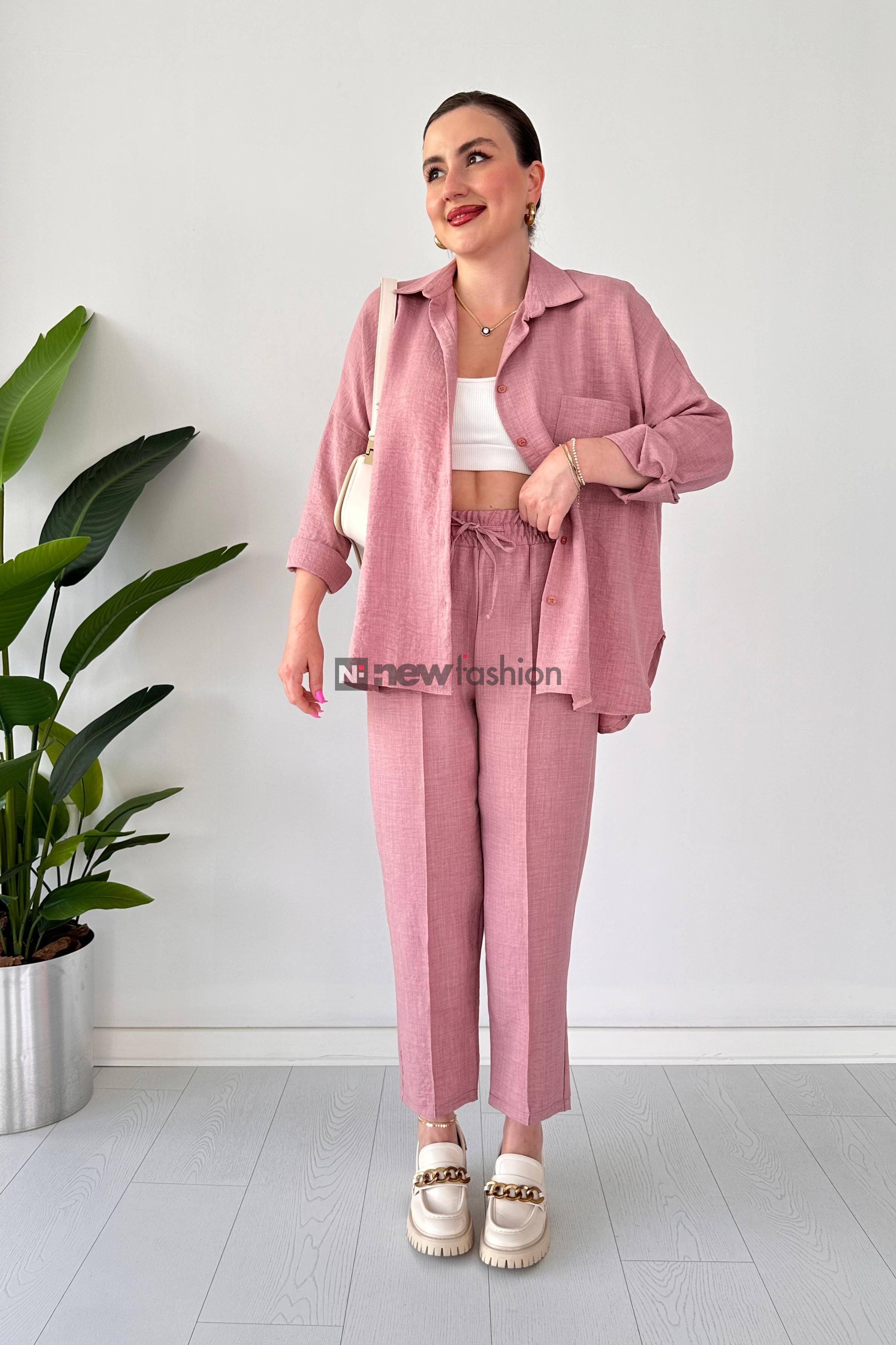 • تنسيق مثالي ومرن: يتكون الطقم من قميص طويل بأكمام قابلة للطي وبنطال مريح بخصر مطاطي، مما يجعله مناسباً للعمل، السفر، أو حتى النزهات مع الصديقات.