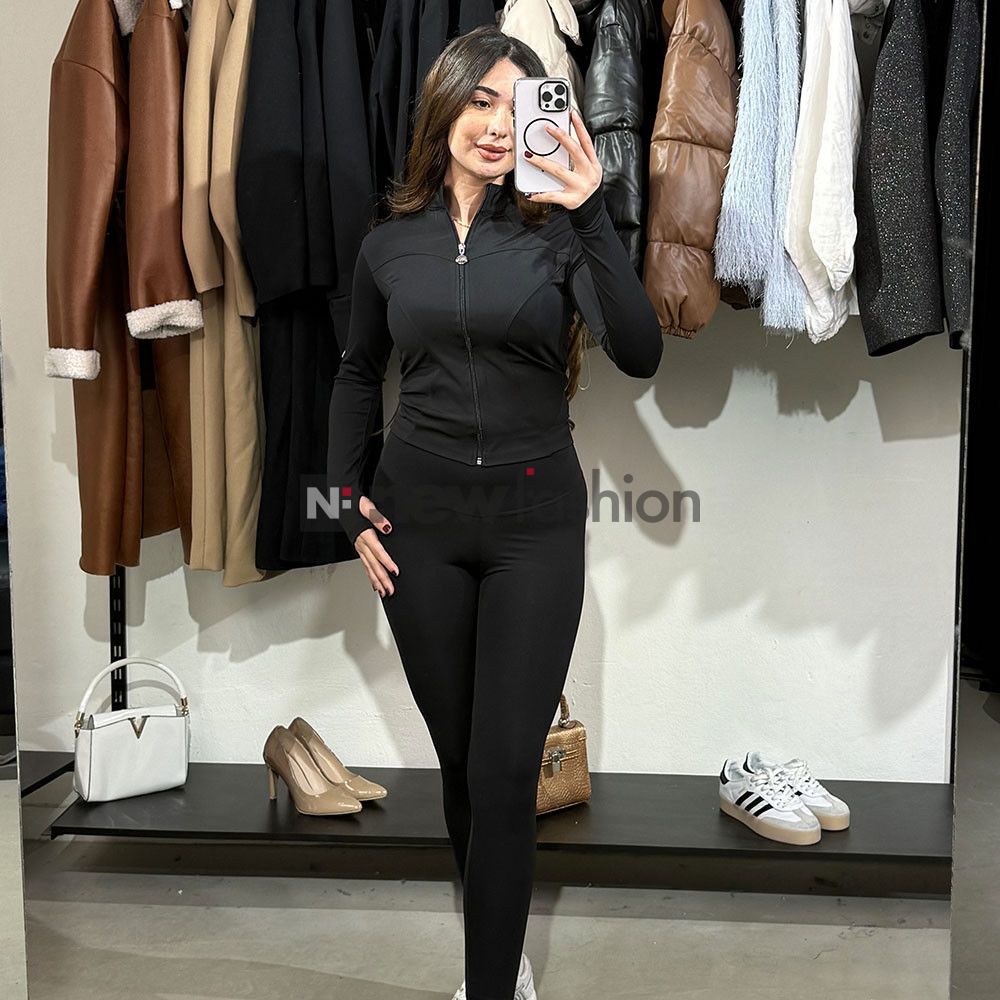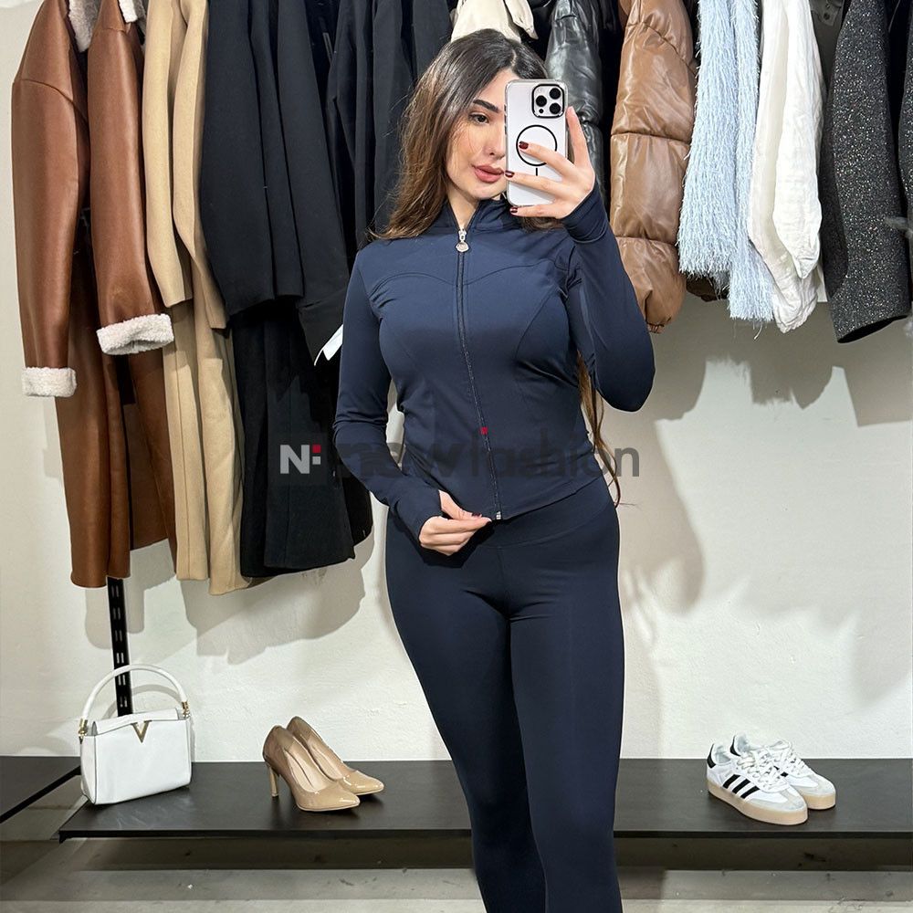 - راحة وعملية: جاكيت بسحاب كامل (Zip-up) مع أكمام طويلة بفتحة للإبهام (Thumbholes) لثبات أكثر أثناء الحركة، وسروال بخصر عالي (High Waist) لشد البطن ودعم الظهر.