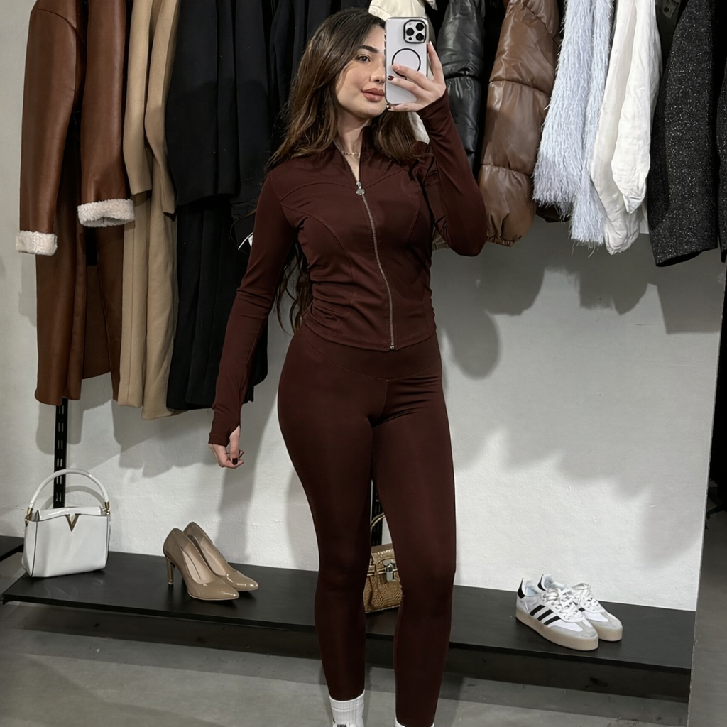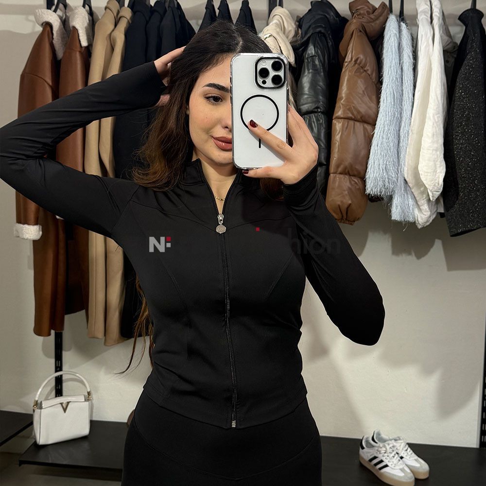- راحة وعملية: جاكيت بسحاب كامل (Zip-up) مع أكمام طويلة بفتحة للإبهام (Thumbholes) لثبات أكثر أثناء الحركة، وسروال بخصر عالي (High Waist) لشد البطن ودعم الظهر.